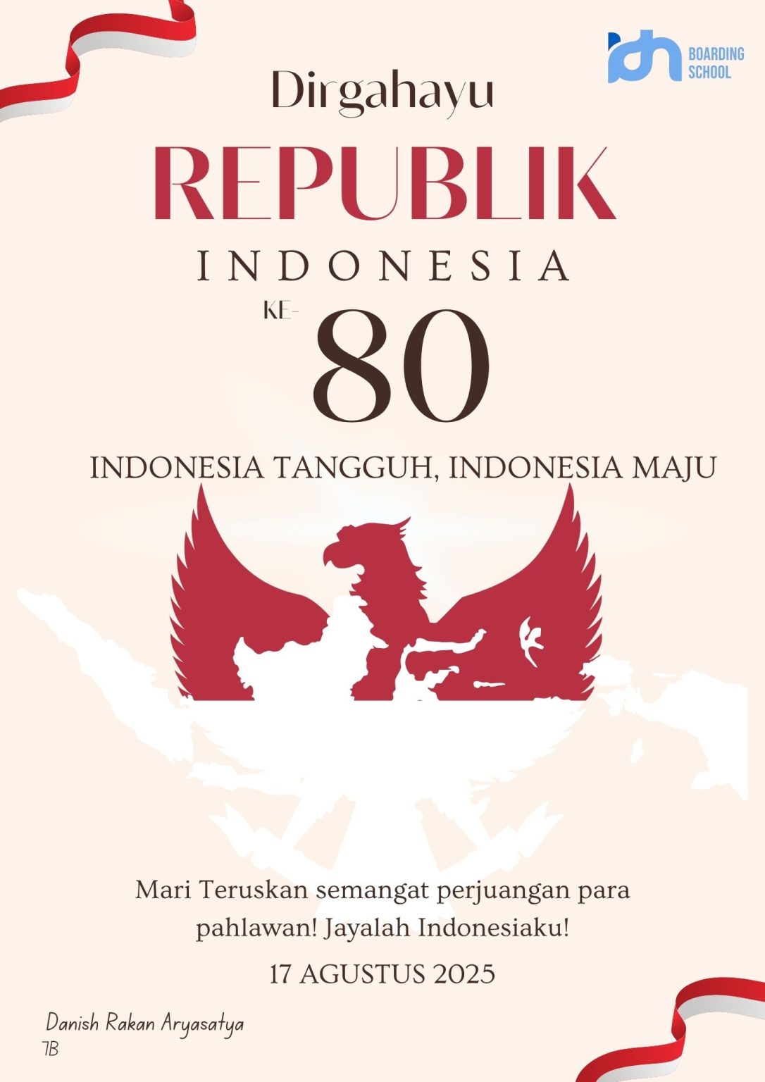 This poster was created to celebrate the 80th Independence Day of the Republic of Indonesia on August 17, 2025. The design highlights the spirit of patriotism with the red Garuda silhouette combined with the map of Indonesia, symbolizing unity and strength. The theme “Indonesia Tangguh, Indonesia Maju” (Resilient Indonesia, Advanced Indonesia) represents the hope for a stronger and more prosperous nation. At the bottom, the message encourages us to continue the spirit of our heroes and to always be proud of Indonesia. 👍