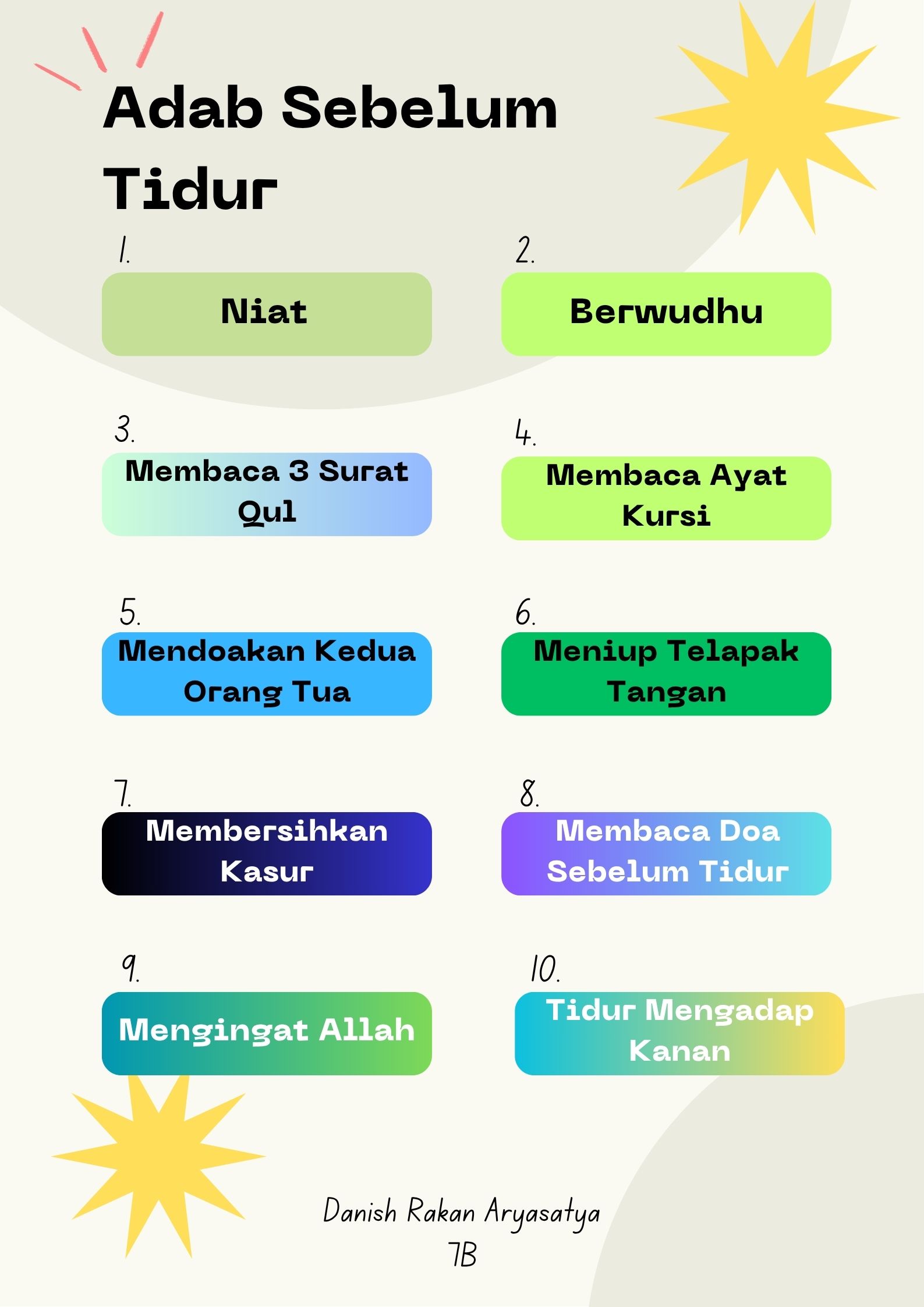This is my poster about Adab Sebelum Tidur but in English, Etiquette Before Going To Bed, I make this poster in a software called Canva, you’ve porbably already know it right, In this poster I made 10 Manners before going to sleep. I use a font on my name and my grade called Canva Student Font, but the others I use Neue Machina. You know me I like minimalist design rather than crowded design. I finish this poster on under 1 hour I think last time, because It’s not that good and It’s not that bad.