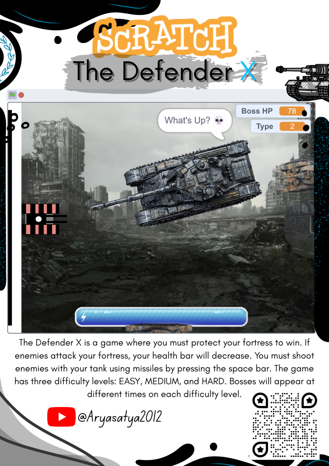 In this game I created, you must kill enemies with your tank using missiles. Before they attack your fort, if the enemy attacks your fort, your health bar will gradually decrease. If your health bar reaches zero, you will immediately lose. If a boss appears, you must attack it with missiles until its health bar reaches zero. The dangerous part is that when the boss attacks your fort, your health bar automatically empties, and you lose.